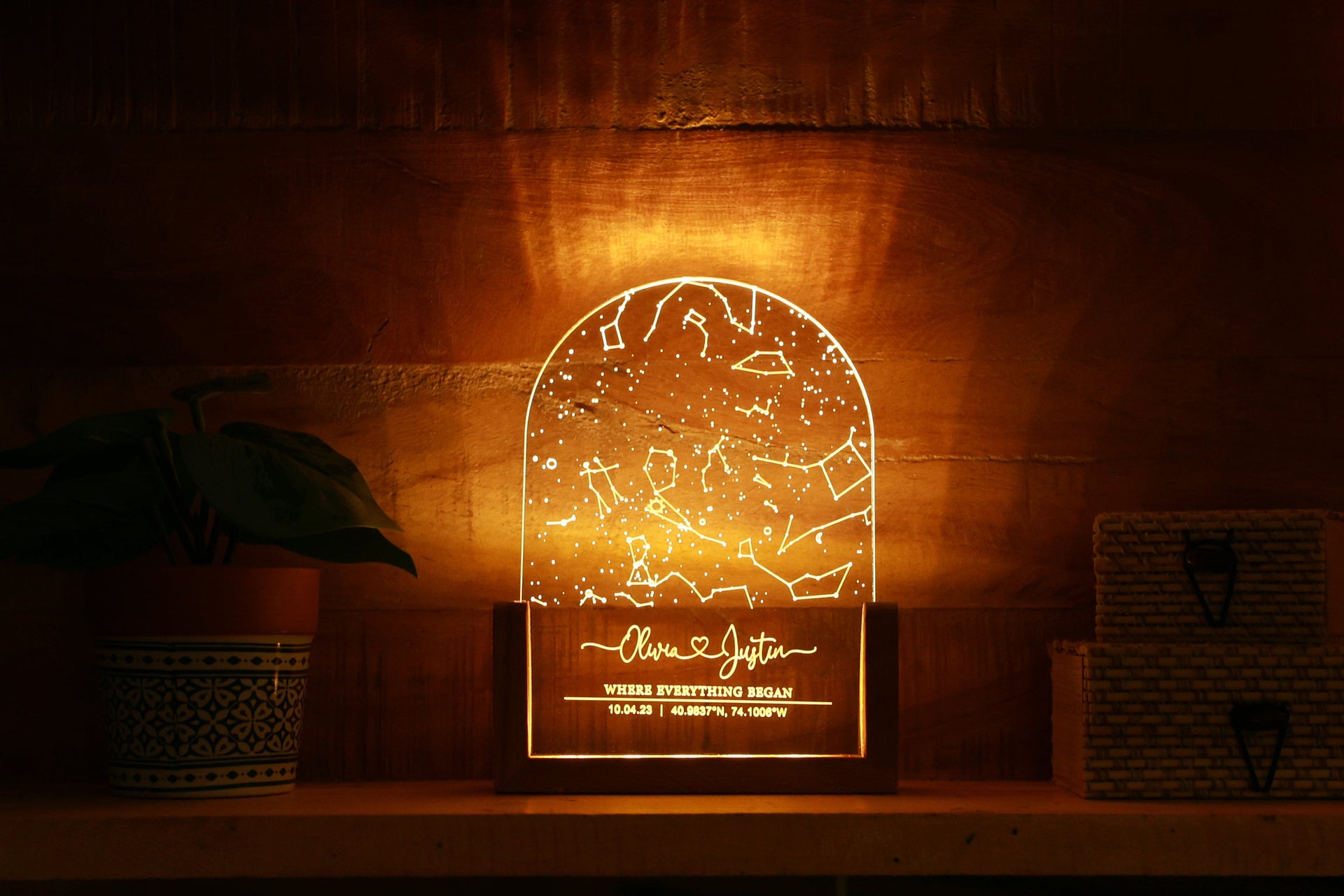Given a location (e.g. a city), a date and time of the day, we can calculate the exact celestial location of all the stars and constellations in that very moment, using astronomical algorithms. We then project these onto a map and engrave it for you and make a beautiful night light so that it serves as a memento of your special moment. For example, first dates, wedding days, birthdays or passed loved ones.